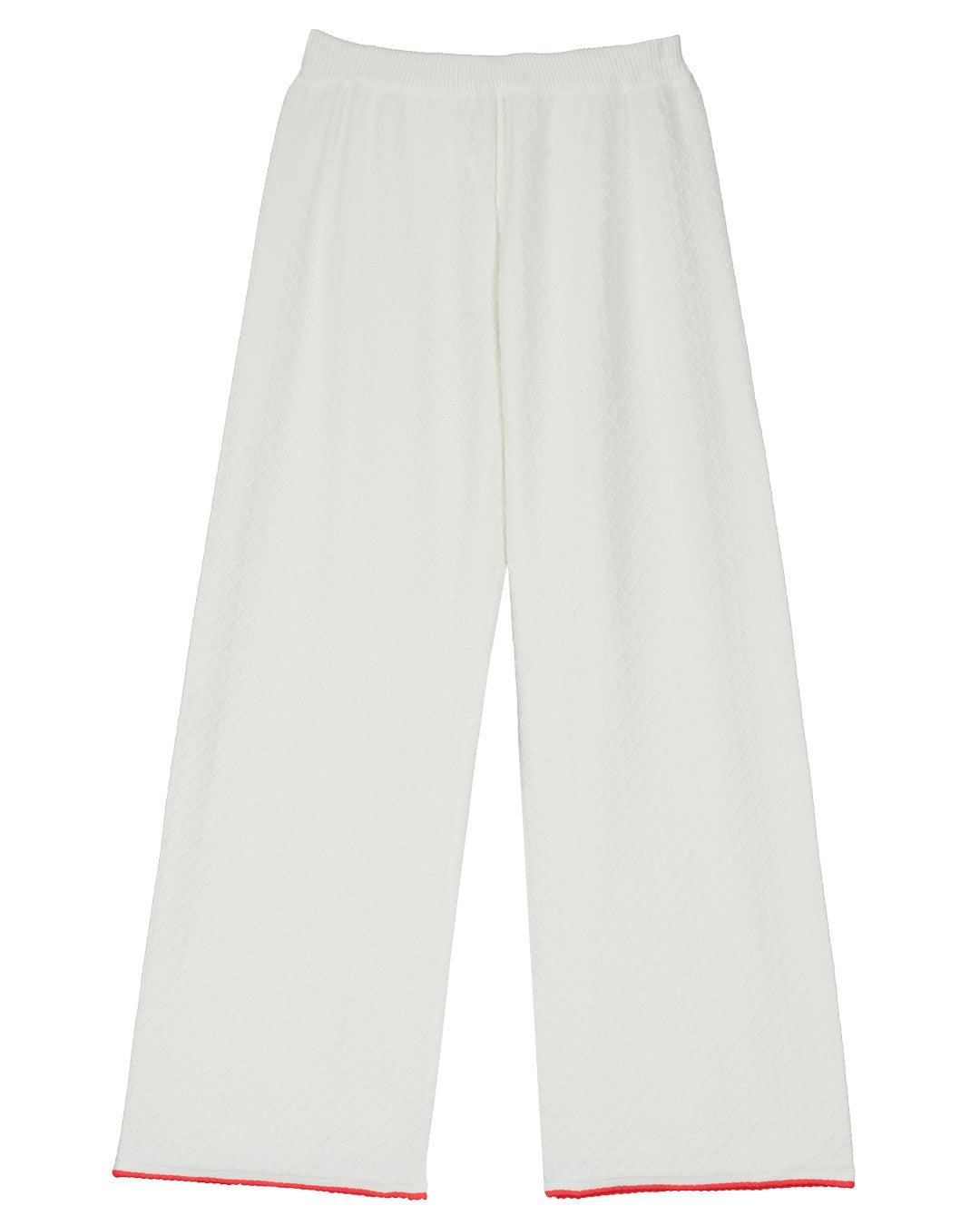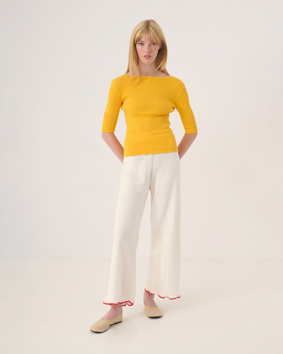 The model is wearing a sample with different red details. The original has the wavy details from the silhouette pictures without a model.